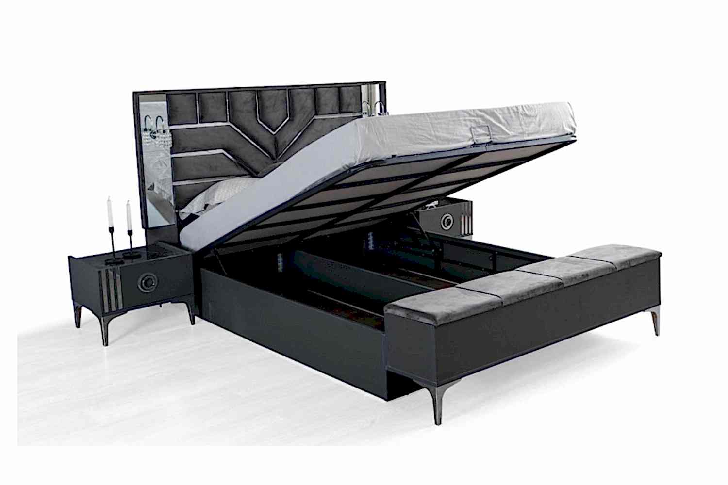 Takım İçeriği  1 Adet karyola, 1 adet gardırop, 2 adet komidin, ve 1 adet şifonyerden oluşmaktadır. Baza hediyedir.