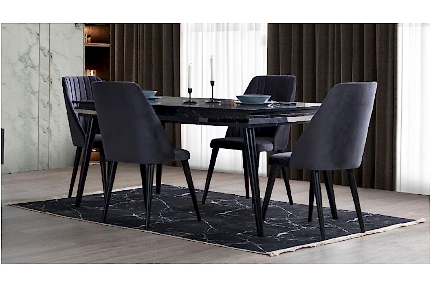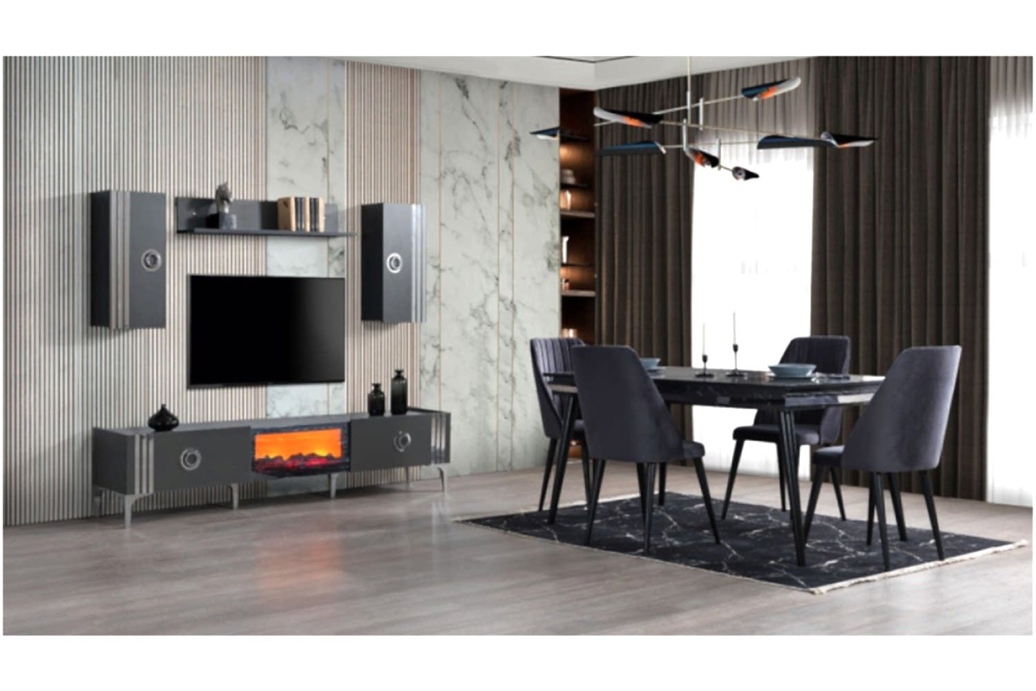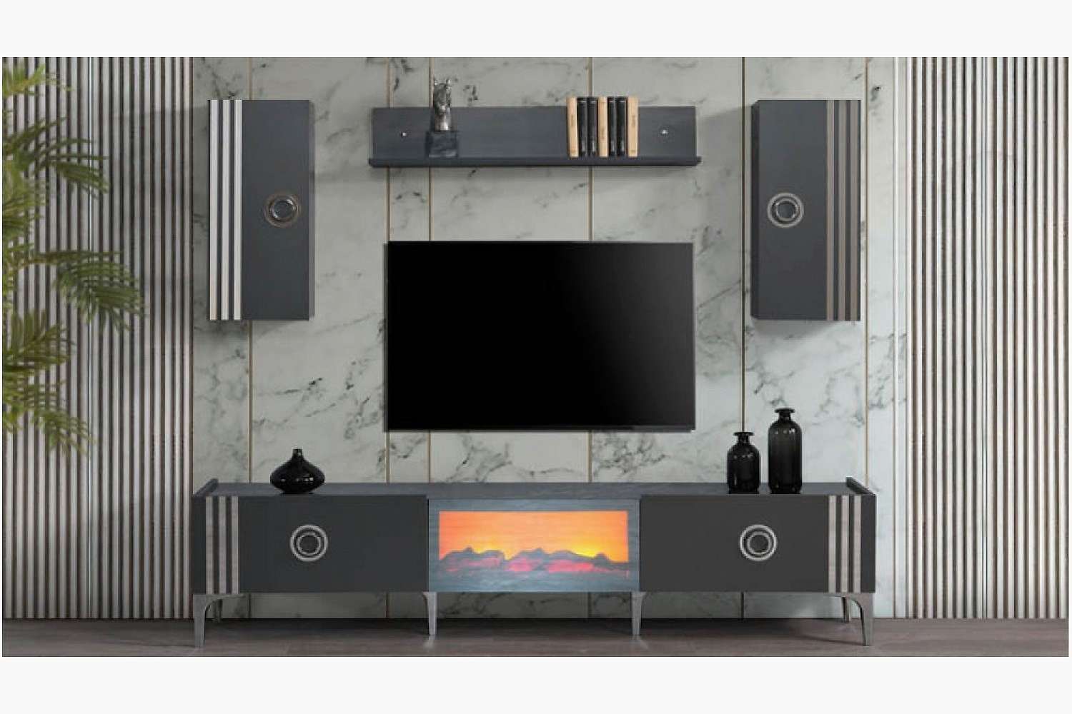 Takım İçeriği 1 adet masa + 4 adet sandalye + 1 adet Konsoldan oluşmaktadır. İsteğe bağlı Tv Ünitesi eklenebilmektedir. İsterseniz, Konsolu iptal edebilir yerine TV ünitesini seçebilirsiniz.